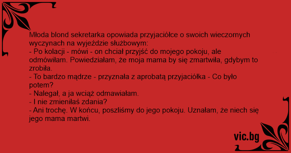 Młoda blond sekretarka opowiada przyjaciółce o swoich wieczornych wyczynach na wyjeździe służbowym: