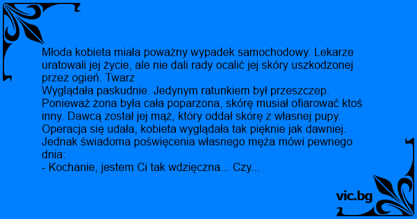 Jedni manželé měli těžkou autonehodu. Manželka utrpěla silné popáleniny na obličeji. Protože byla hrozně hubená, nebylo možné vzít jí z těla kůži k transplantaci. Doktor nakonec požádal manžela,...