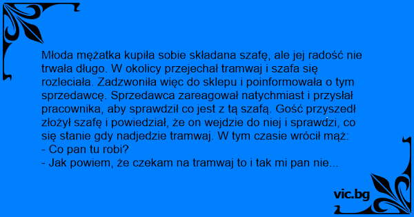 Młoda mężatka kupiła sobie składana szafę, ale jej radość nie trwała długo. W okolicy przejechał tramwaj i szafa się rozleciała. Zadzwoniła więc do sklepu i poinformowała o tym sprzedawcę. Sprzedawca zareagował natychmiast i przysłał pracownika, aby sprawdził co jest z tą szafą. Gość przyszedł złożył szafę i powiedział, że on wejdzie do niej i sprawdzi, co się stanie gdy nadjedzie tramwaj. W tym czasie wrócił mąż:
