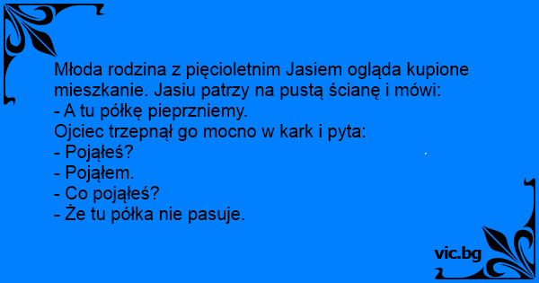 Młoda rodzina z pięcioletnim Jasiem ogląda kupione mieszkanie. Jasiu patrzy na pustą ścianę i mówi: