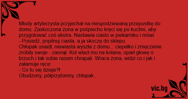 Młody artylerzysta przyjechał na niespodziewaną przepustkę do domu. Zaskoczona żona w pośpiechu kręci się po kuchni, aby przygotować coś ekstra. Nastawia ciasto w piekarniku i mówi: