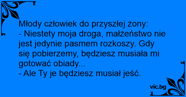- Niestety moja droga, małżeństwo nie jest jedynie pasmem rozkoszy. Gdy się pobierzemy, będziesz musiała mi gotować obiady...
