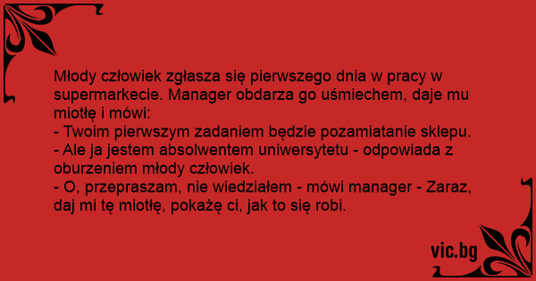 - O, przepraszam, nie wiedziałem - mówi manager - Zaraz, daj mi tę miotłę, pokażę ci, jak to się robi.