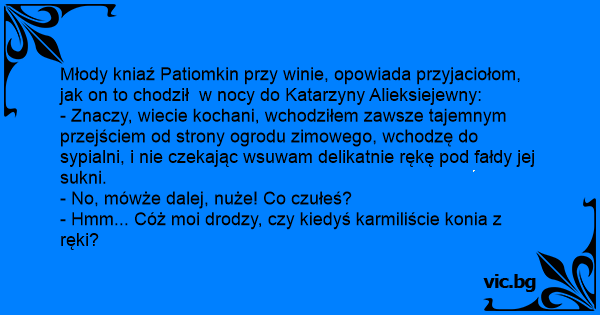 - Znaczy, wiecie kochani, wchodziłem zawsze tajemnym przejściem od strony ogrodu zimowego, wchodzę do sypialni, i nie czekając wsuwam delikatnie rękę pod fałdy jej sukni.