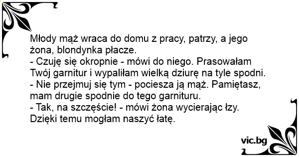 - Tak, na szczęście! - mówi żona wycierając łzy. Dzięki temu mogłam naszyć łatę.