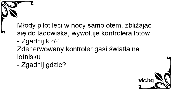 Mladý pilot, strašný frajer, jde na svoje první samostatné noční přistání. Na místo obvyklého hlášení se dispečerovi letiště zahlásí do vysílačky: „Hádej kdo?” Dispečer vypne světla na celé...