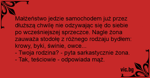 Mąż i żona jadą przez wieś samochodem. Nie odzywają się do siebie, bo są po kłótni. Nagle żona spostrzega stado świń i pyta pogardliwie męża: - Twoja rodzina? - Tak, teściowie.