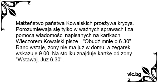 Małżeństwo państwa Kowalskich przeżywa kryzys. Porozumiewają się tylko w ważnych sprawach i za pomocą wiadomości napisanych na kartkach. Wieczorem Kowalski pisze - "Obudź mnie o 6.30".