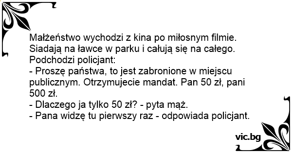 Małżeństwo wychodzi z kina po miłosnym filmie. Siadają na ławce w parku i całują się na całego. Podchodzi policjant: