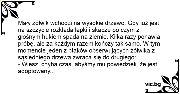 Egy kis teknős elkezd felfelé mászni a fán. Nagy nehezen eléri az alsó ágat, végigmászik rajta, majd amikor a végéhez ér, leesik. Pont a hátára esik, a páncélja nagyot koppan. Pár perc múlva...