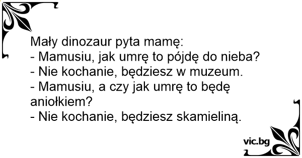 Mały dinozaur pyta się mamy: - Mamo, czy jak umrę to pójdę do nieba? - Nie synku, do muzeum...