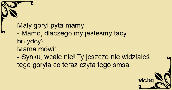 - Synku, wcale nie! Ty jeszcze nie widziałeś tego goryla co teraz czyta tego smsa.