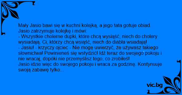 - Jasiu! - krzyczy ojciec - Nie mogę uwierzyć, że używasz takiego słownictwa! Powinieneś się wstydzić! Idź teraz do swojego pokoju i nie wracaj, dopóki nie przemyślisz tego, co zrobiłeś!