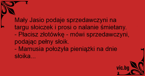Mały Jasio podaje sprzedawczyni na targu słoiczek i prosi o nalanie śmietany.