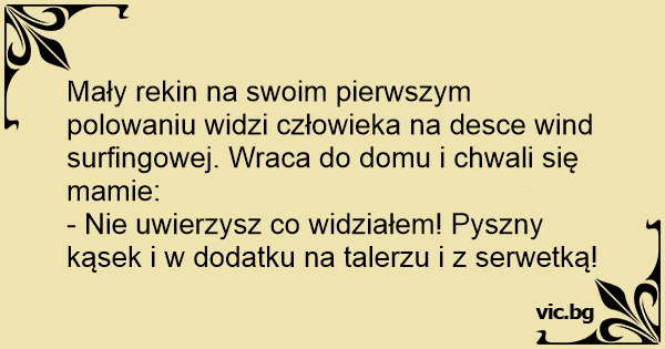 Mały rekin na swoim pierwszym polowaniu widzi człowieka na desce wind surfingowej. Wraca do domu i chwali się mamie: