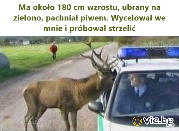 He is about 180 cm tall, dressed in green clothes, smelled of вееr. Aimed at me and tried to shoot me