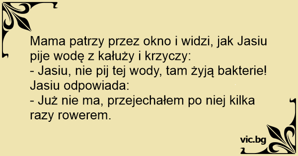 Mama patrzy przez okno i widzi, jak Jasiu pije wodę z kałuży i krzyczy: