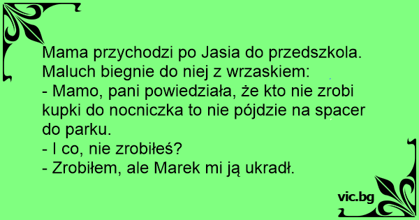 - Mamo, pani powiedziała, że kto nie zrobi kupki do nocniczka to nie pójdzie na spacer do parku.
