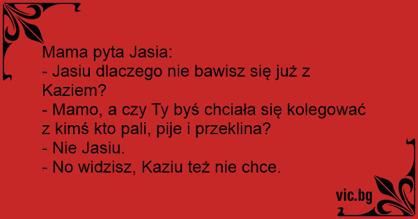 Mama pyta Jasia:<br />- Jasiu dlaczego nie bawisz się już z Kaziem?<br />- Mamo, a czy Ty byś chciała się kolegować z kimś kto pali, pije i przeklina?<br />- Nie Jasiu.<br />- No widzisz, Kaziu też nie chce.