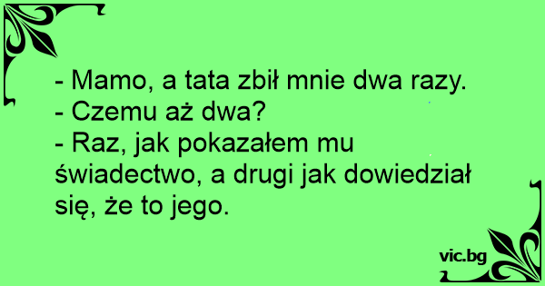 Малиот Трпе му раскажува на Цветко: - Вчера тато ме тепаше два пати! - А зошто два пати? - Првиот пат ме тепаше кога му ја покажав книшката полна со единици, а вториот пат кога сфати дека тоа е неговата книшка кога одел во школо…
