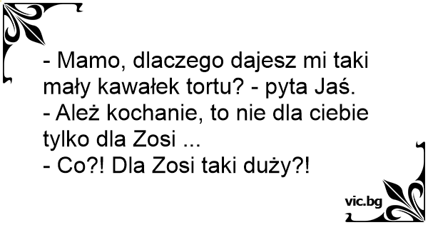 - Mamo, dlaczego dajesz mi taki mały kawałek tortu? - pyta Jaś.
