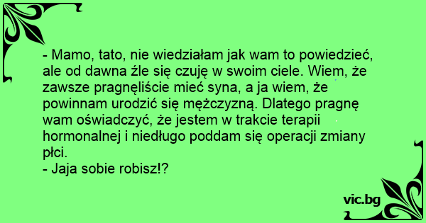 - Mamo, tato, nie wiedziałam jak wam to powiedzieć, ale od dawna źle się czuję w swoim ciele. Wiem, że zawsze pragnęliście mieć syna, a ja wiem, że powinnam urodzić się mężczyzną. Dlatego pragnę wam oświadczyć, że jestem w trakcie terapii hormonalnej i niedługo poddam się operacji zmiany płci.