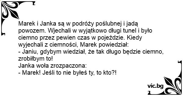 Marek i Janka są w podróży poślubnej i jadą powozem. Wjechali w wyjątkowo długi tunel i było ciemno przez pewien czas w pojeździe. Kiedy wyjechali z ciemności, Marek powiedział: