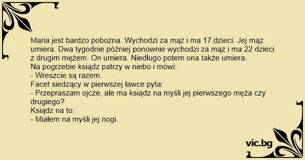 Maria jest bardzo pobożna. Wychodzi za mąż i ma 17 dzieci. Jej mąż umiera. Dwa tygodnie później ponownie wychodzi za mąż i ma 22 dzieci z drugim mężem. On umiera. Niedługo potem ona także umiera.