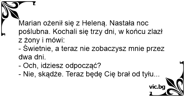 Marian ożenił się z Heleną. Nastała noc poślubna. Kochali się trzy dni, w końcu zlazł z żony i mówi: