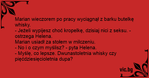- Myślę, co lepsze. Dwunastoletnia whisky czy pięćdziesięcioletnia dupa?