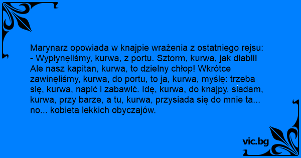 - Wypłynęliśmy, kurwa, z portu. Sztorm, kurwa, jak diabli! Ale nasz kapitan, kurwa, to dzielny chłop! Wkrótce zawinęliśmy, kurwa, do portu, to ja, kurwa, myślę: trzeba się, kurwa, napić i zabawić. Idę, kurwa, do knajpy, siadam, kurwa, przy barze, a tu, kurwa, przysiada się do mnie ta... no... kobieta lekkich obyczajów.