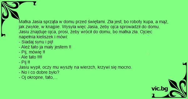 Matka Jasia sprząta w domu przed świętami. Zła jest, bo roboty kupa, a mąż, jak zwykle, w knajpie. Wysyła więc Jasia, żeby ojca sprowadził do domu. Jasiu znajduje ojca, prosi, żeby wrócił do domu, bo matka zła. Ojciec napełnia kieliszek i mówi: