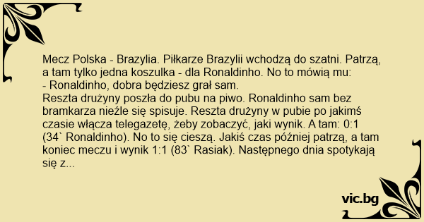 Mecz Polska - Brazylia. Piłkarze Brazylii wchodzą do szatni. Patrzą, a tam tylko jedna koszulka - dla Ronaldinho. No to mówią mu: