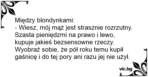 - Wiesz, mój mąż jest strasznie rozrzutny. Szasta pieniędzmi na prawo i lewo, kupuje jakieś bezsensowne rzeczy. Wyobraź sobie, że pół roku temu kupił gaśnicę i do tej pory ani razu jej nie użył.