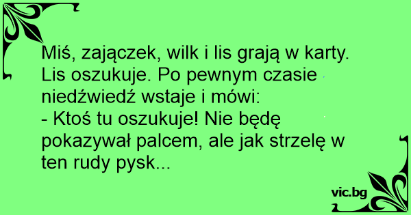 Miś, zajączek, wilk i lis grają w karty. Lis oszukuje. Po pewnym czasie niedźwiedź wstaje i mówi: