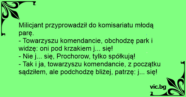 - Towarzyszu komendancie, obchodzę park i widzę: oni pod krzakiem j... się!