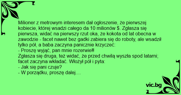 Milioner z metrowym interesem dał ogłoszenie, że pierwszej kobiecie, której wsadzi całego da 10 milionów $. Zgłasza się pierwsza, widać na pierwszy rzut oka, że kokota od lat obecna w zawodzie - facet nawet bez gadki zabiera się do roboty, ale wsadził tylko pół, a baba zaczyna panicznie krzyczeć: