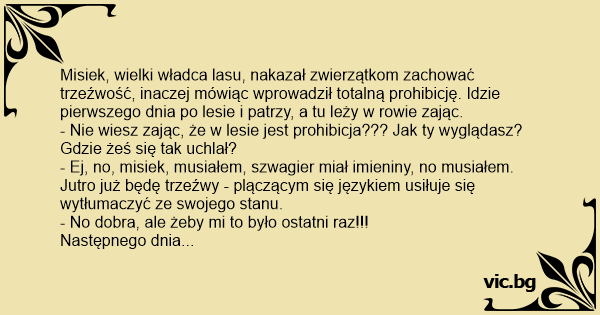 - Nie wiesz zając, że w lesie jest prohibicja??? Jak ty wyglądasz? Gdzie żeś się tak uchlał?