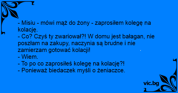 - Misiu - mówi mąż do żony - zaprosiłem kolegę na kolację.