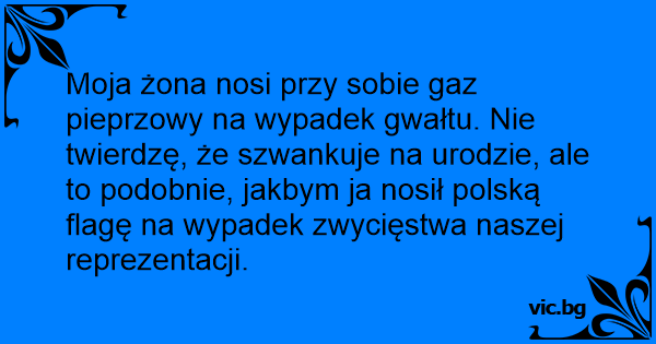 Moja żona nosi przy sobie gaz pieprzowy na wypadek gwałtu. Nie twierdzę, że szwankuje na urodzie, ale to podobnie, jakbym ja nosił polską flagę na wypadek zwycięstwa naszej reprezentacji.