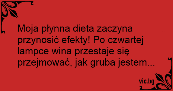 Moja płynna dieta zaczyna przynosić efekty! Po czwartej lampce wina przestaje się przejmować, jak gruba jestem...