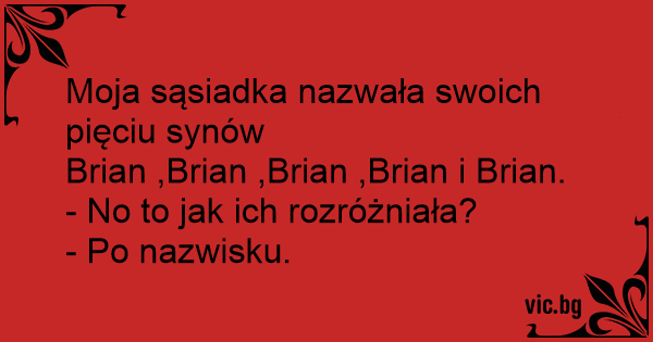 Moja sąsiadka nazwała swoich pięciu synów Brian ,Brian ,Brian ,Brian i Brian.