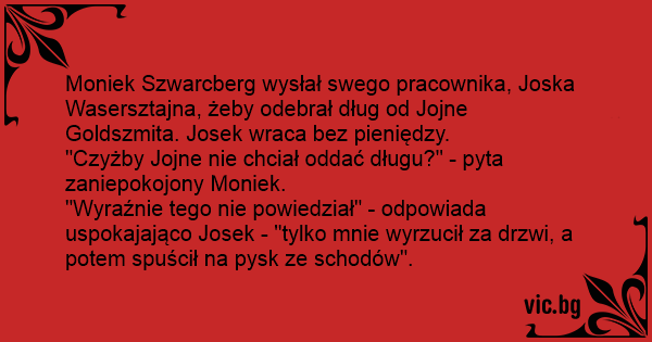 "Wyraźnie tego nie powiedział" - odpowiada uspokajająco Josek - "tylko mnie wyrzucił za drzwi, a potem spuścił na pysk ze schodów".