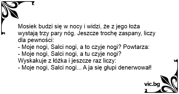 Mosiek budzi się w nocy i widzi, że z jego łoża wystają trzy pary nóg. Jeszcze trochę zaspany, liczy dla pewności: