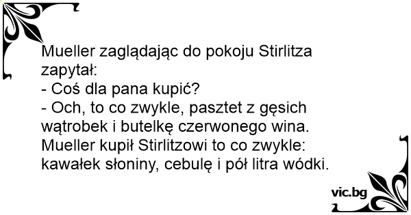 Mueller kupił Stirlitzowi to co zwykle: kawałek słoniny, cebulę i pół litra wódki.