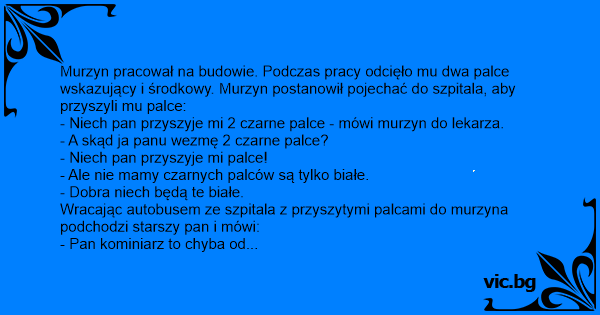 Murzyn pracował na budowie. Podczas pracy odcięło mu dwa palce wskazujący i środkowy. Murzyn postanowił pojechać do szpitala, aby przyszyli mu palce: