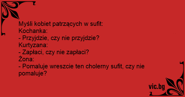 Šta misle devojka, prostitutka i udata žena dok vode ljubav? Devojka misli: važno je da ne ostanem trudna. Prostitutka misli: nadam se da ovaj dobro plaća. Žena misli: ovaj plafon stvarno mora da...