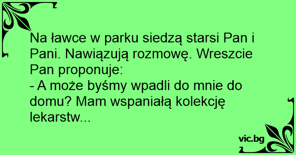 Na ławce w parku siedzą starsi Pan i Pani. Nawiązują rozmowę. Wreszcie Pan proponuje: