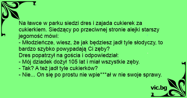 Na ławce w parku siedzi dres i zajada cukierek za cukierkiem. Siedzący po przeciwnej stronie alejki starszy jegomość mówi:
