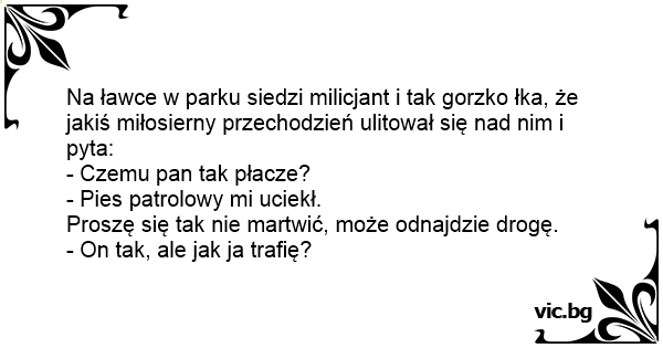 Na ławce w parku siedzi milicjant i tak gorzko łka, że jakiś miłosierny przechodzień ulitował się nаd nim i pyta: